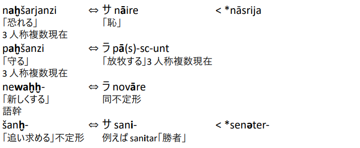 最初の3例では a+ḫ=ā という式が成り立つことがわかる。そしてヒッタイト語の a を印欧祖語の e と見なせば、この a+ḫ=ā はまさにド・ソシュールの e+A=ā 、クリウォヴィチの e+ə2= ā、つまりド・ソシュールが音価を特定せずに計算式(違)で導き出した「ソナント」または「ある種の喉音」が本当に存在したことが示されているのである。一番下の例ではこのソナントが子音の後という音韻環境で母音化してブルクマンらのいうシュワーとなり、サンスクリットで公式どおり i で現れているのだ。