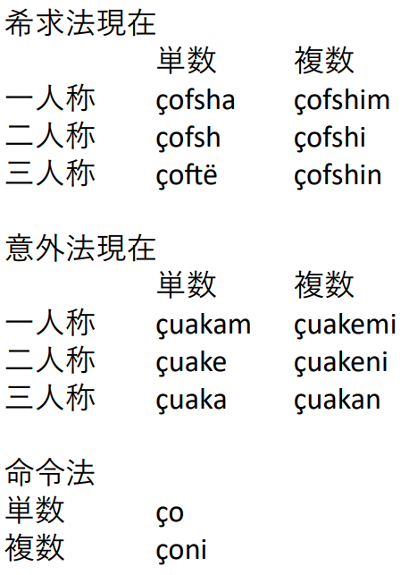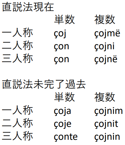 さてそのアルバニア語は、どこかの言語学者も言っていたように、「語学というより言語学的な興味で始める人が多かろう」。印欧語の古いパラダイムをよく残している非常に魅力ある言語である。例として以下に çoj (take away, send) という動詞の変化パラダイムの一部を挙げるが、アオリストや希求法などがカテゴリーとしてしっかり残っており、これと比べるとドイツ語やロシア語などチョロイの一言に尽きる。たかがロシア語の不規則動詞ごときにヒーヒー言っていたり(私のことだ)、変化形を覚えたと言って鼻の穴を膨らませて自慢しているような輩(これも私のことだ)などは、ジェリライ氏に恥じろ。繰り返すが、これは動詞変化のごく一部、動詞部分が直接変化するパラダイムのそのまた一部である。これにまた接続法一連、完了体など助動詞や不変化詞による動詞パラダイム(アオリスト2もそれ)やそもそも受動体(これにもまた直説法現在形、接続法現在形などのパラダイムがオンパレード)などがガンガン加わってくるから、ここに示したのは動詞の変化形全体の10分の一にも満たない。もちろんこれは最も簡単な動詞で、他に不規則動詞も当然ある。ラテン語や現在のロマンス諸語より強烈なのではなかろうか。