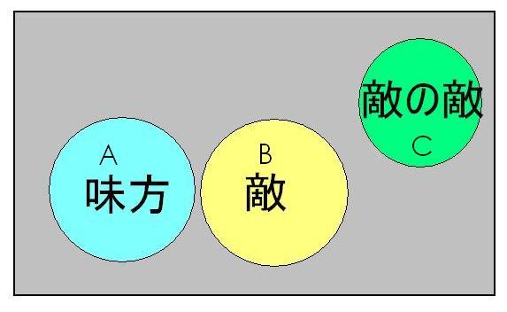 戦争だろ暴力団の抗争などで「敵の敵は味方」とみなされることがある。また独裁者や技量の狭い政治家が味方以外は敵、つまり自分にヘイコラしてこない者は敵と見て粛清したりする。こういうものの見方をしてうまく行ったためしはない。前者の場合抗争が終わると、いや抗争中からすでに友人のはずの敵の敵から牙を向けられる(いわゆる「寝返る」というやつである)可能性大だし、後者では粛清の度がすぎて「そして誰もいなくなった状態」になり、自分の足元が崩れ落ちることが多いからだ。
