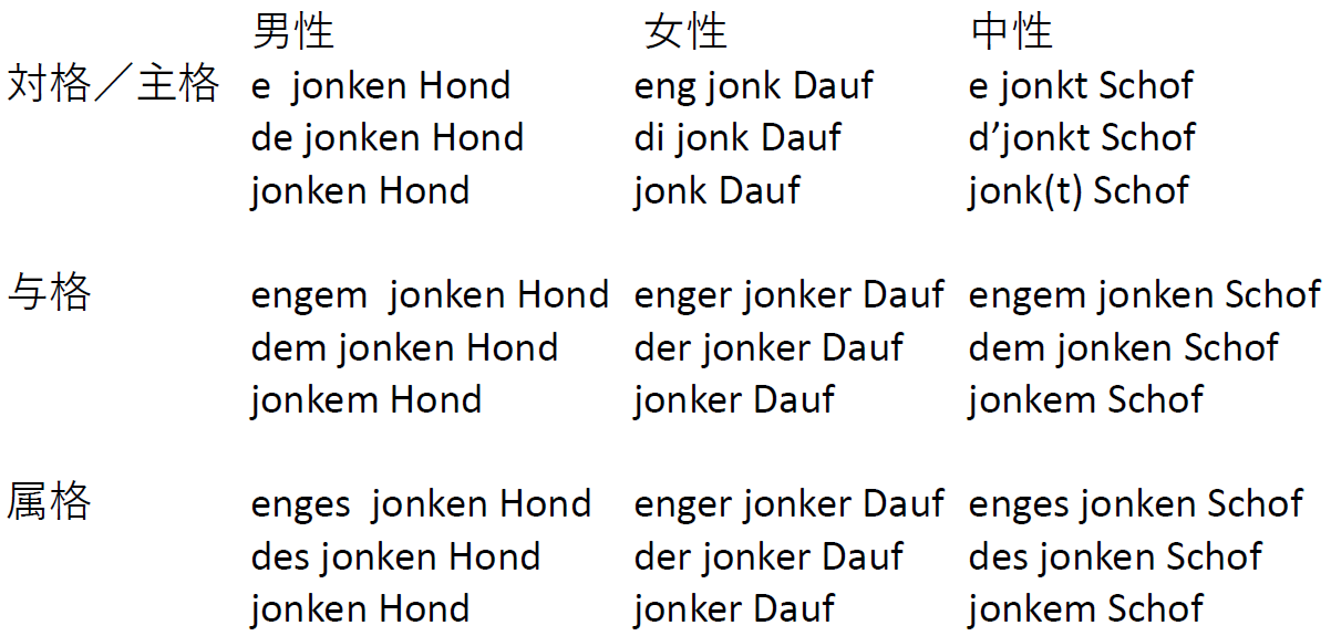 少しそのルクセンブルク語の語形変化の例を見てみよう。以下の表はそれぞれドイツ語で junger Hund「若い犬」、junge Taube「若い鳩」、junges Schaf「若い羊」の変化。上から順に混合変化(不定冠詞)、弱変化(定冠詞)、強変化(冠詞なし)である。