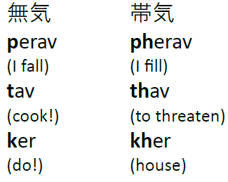 (ここでxというのはあくまで [x]、つまり軟口蓋で出す摩擦音のことで「クス」とか「エックス」ではない) しかし実は別にミクロシッチほどの専門家でない、私のような素人目にもロマニ語はインドあたりの起源なのではないかと薄々感じることができる。この言語は音韻上、無気音と帯気音を弁別するからだ。これらは今のヨーロッパ内の印欧語ではアロフォンだ。帯気音は子音の後ろに h をつけて表すが例えばロマニ語には次のようなミニマル・ペアがある。