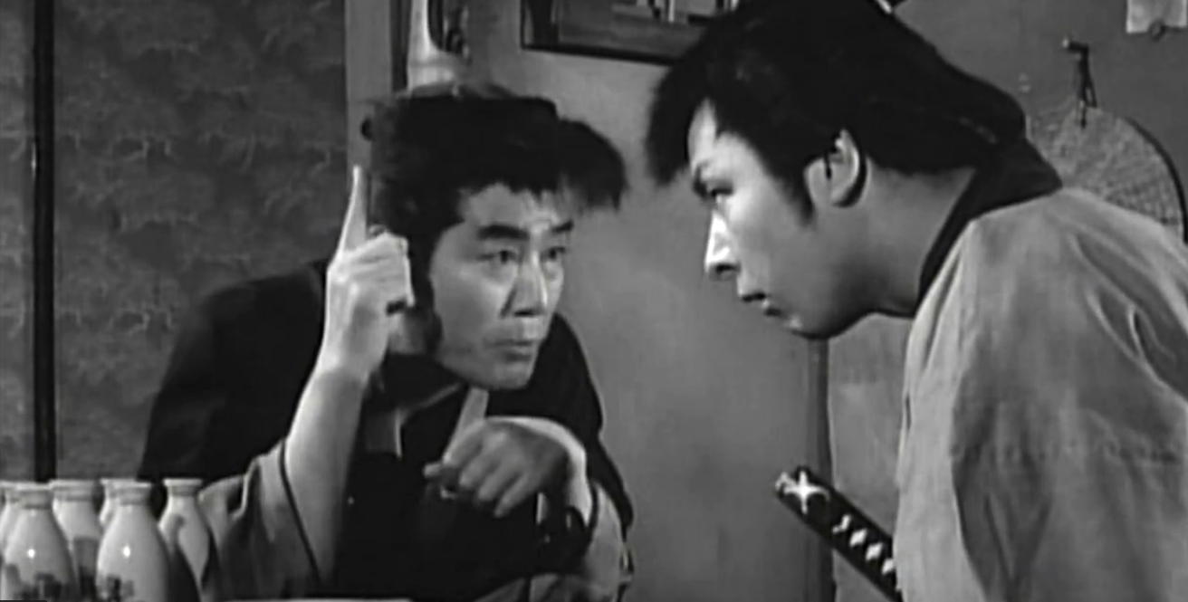 東の近衛十四郎と品川隆二。互いに相手の懐を当てにして居酒屋で酒を食らったはいいが、実は両方ともスカンピンだったという定番な展開。