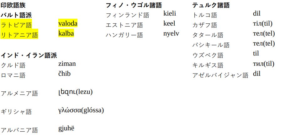 ここまでをまとめてみると、ヨーロッパの印欧語では「言葉」は本来「舌」の意味だった同一語 dn̥ǵʰwéh₂s で表される。特にゲルマン語派など例外的に「話す、言う」を使う言語もあるが基本は舌=ことば。dn̥ǵʰwéh₂s を使わない言語でもこの原則は保たれる。ヨーロッパはさらに非印欧語でも「舌」と「ことば」が同じ語になる、ということだ。