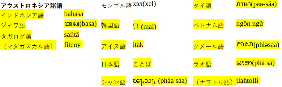 まず東南アジアはほとんどインド南部の言語と同じくサンスクリットの「話す=ことば」भाषा(bhāṣā)からの借用である。アウストロネシア諸語のインドネシア語、ジャワ語は一目で明らかだが、シャン語、タイ語、クメール語、ラオ語も全てこれだ。仏教と共に言葉も輸入されたのではないだろうか。タガログ語だけは形が違っているが、出所はやはりサンスクリットで चरित(caritá)という語から来ているそうだ。「動く、行動する」という意味である。うーん…