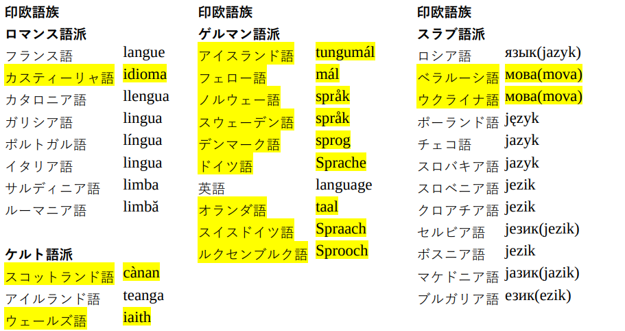 次のスラブ語派だが、jazyk、jezik などは下でも述べる通り皆「舌」だ。古い印欧語形である。ウクライナ語とベラルーシ語の mova はスラブ祖語から。「言う」である。