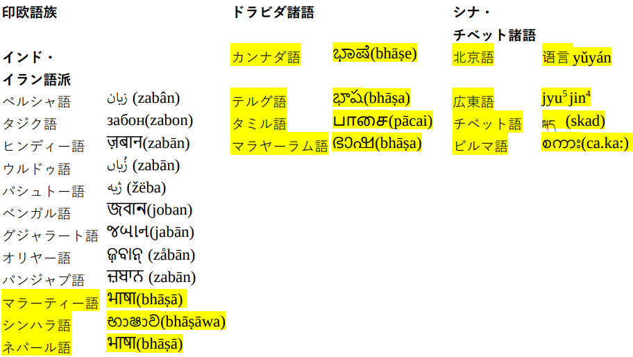 実はこのサンスクリットの「話す→ことば」という語は強烈な影響力を持っていて、「舌系」のヒンディー語、ウルドゥ語、パンジャブ語、ベンガル語、グジャラート語にも zabān などの同意語としてそれぞれ भाषा(bhāṣā)、بھَاشَا(bhāśā)、ভাষা(bhaśa)、ਭਾਸ਼ਾ (bhāśā)、ભાષા(bhāṣā)という「ことば」という語がある。「話す系」が水面下で深く浸透しているということだ。この点もヨーロッパとの違いだろう。逆に黄色に塗った3言語については「舌系」の方の同義語は確認できなかった。でも探せば実はあるかもしれない。