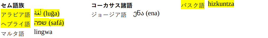 まず、ジョージア語は「舌」を兼ねる。アラビア語 لُغَة (luḡa) は「言語」あるいは「方言」で、「舌」とは別だ。上でも述べたようにアラビア語にはこの他に「舌」も兼ねた لِسَان (lisān)という語がある。ヘブライ語の שפה (safá) は「舌」でなく「唇」の意味を兼ねているそうだ。実にややこしい。また同じセム語族でもマルタ語は政治的にヨーロッパの支配下にあった時期が長く、イタリア語の影響を強く受けている。道理で明らかにロマンス語からの借用である。ただマルタ語には lsien というセム語系の本来の語も存在する。