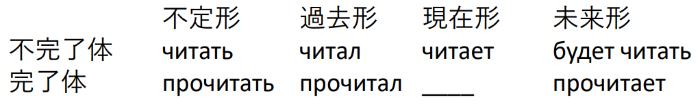 例えば完了体 признать(priznat') 対不完了体 признавать(priznavat')「承認する」が1の例、完了体 решить(rešit') 対不完了体 решать(rešat')「決める」が2、完了体 осветить(osvetit')対不完了体 освещать(osvešat')「明るくする」が3の例だ。